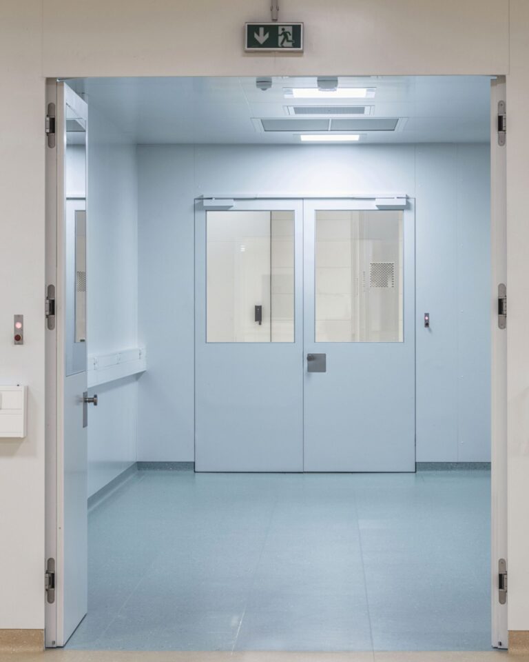 Abhängig von Materialtyp, Gewicht und Abmessungen kann das Ein- und Ausschleusen von Materialien entweder über bodentiefe Schleusen – ausgestattet mit Drehflügeltüren, Schnelllauftoren oder Rolladensystemen – oder über in das Wandsystem integrierte Durchreichen erfolgen. Ziel all dieser Systeme ist es, Materialien kontrolliert und reinraumgerecht in den Reinraum ein- bzw. auszuschleusen, wobei gleichzeitig die Reinraumbedingungen wie Druckverhältnisse und Kontaminationsschutz aufrechterhalten bleiben müssen. Dabei ist es essenziell, dass bei Schleusen und Durchreichen eine gegenseitige Verriegelung der Türen – entweder mechanisch oder elektromagnetisch – gewährleistet ist, um ein gleichzeitiges Öffnen zu verhindern, ähnlich wie bei Personenschleusen. Ebenso muss bei der Auswahl und Konstruktion von Durchreiche- und Schleusensystemen auf reinraumtaugliche, leicht zu reinigende Materialien und Oberflächen geachtet werden. Unsere Schleusensysteme bestehen daher ausschließlich aus Edelstahl und Aluminium.